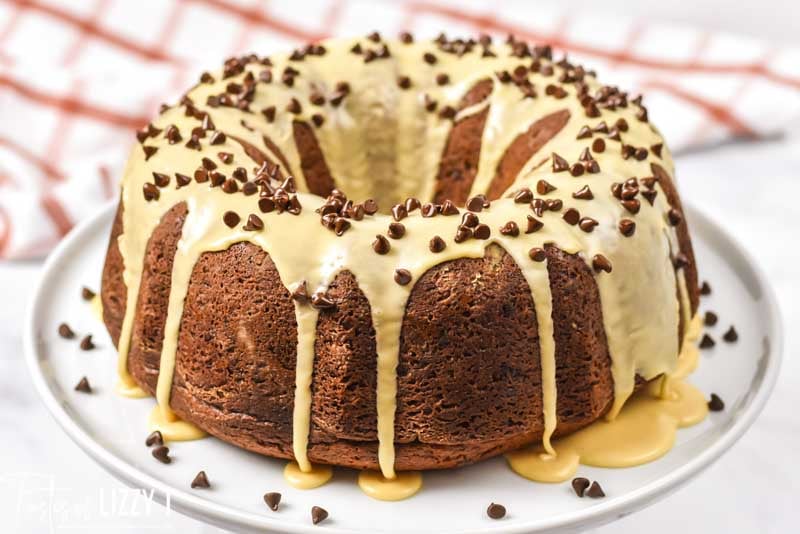 - Drizzle glaze over top of the cake. Finish by sprinkling ¼ cup mini chocolate chips over the glaze.