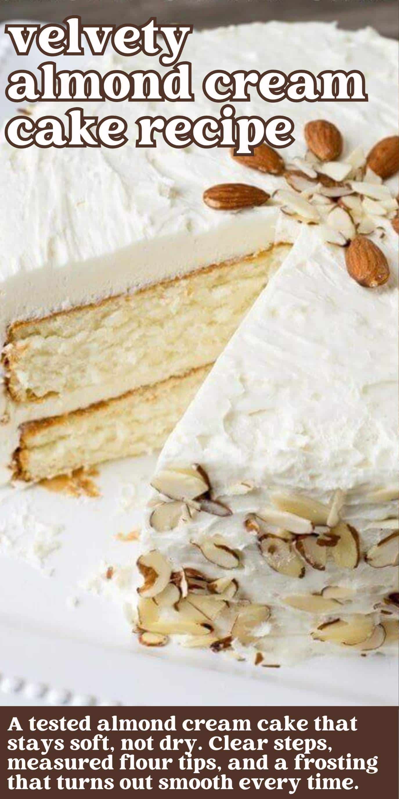 This almond cream cake is soft, moist, and holds its texture every time. No dry layers, no guesswork.
