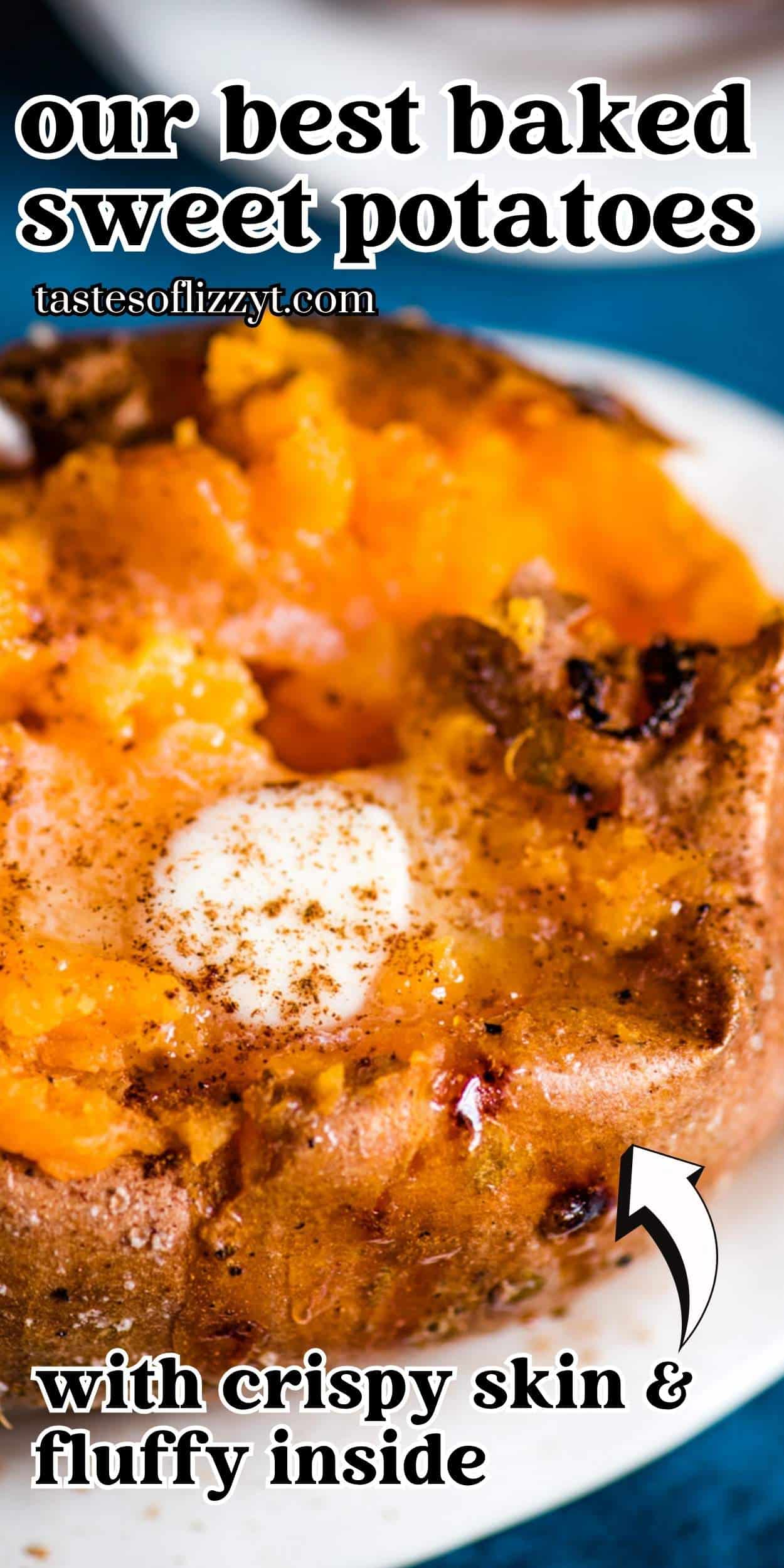 How to make the BEST baked sweet potatoes! We’ll give you hints on how to get a crispy crust and fluffy potatoes inside.