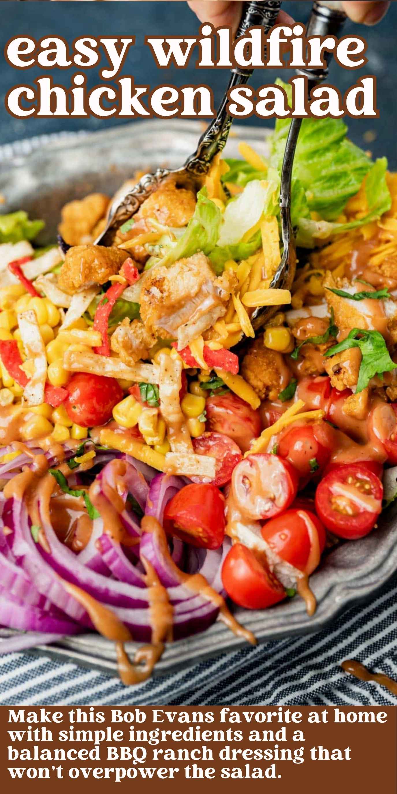 Wildfire chicken salad is a loaded dinner salad made popular by Bob Evans. It combines lettuce, chicken, corn, cheese, tomatoes, onion, and crunchy tortilla strips, all topped with a creamy barbecue ranch dressing.