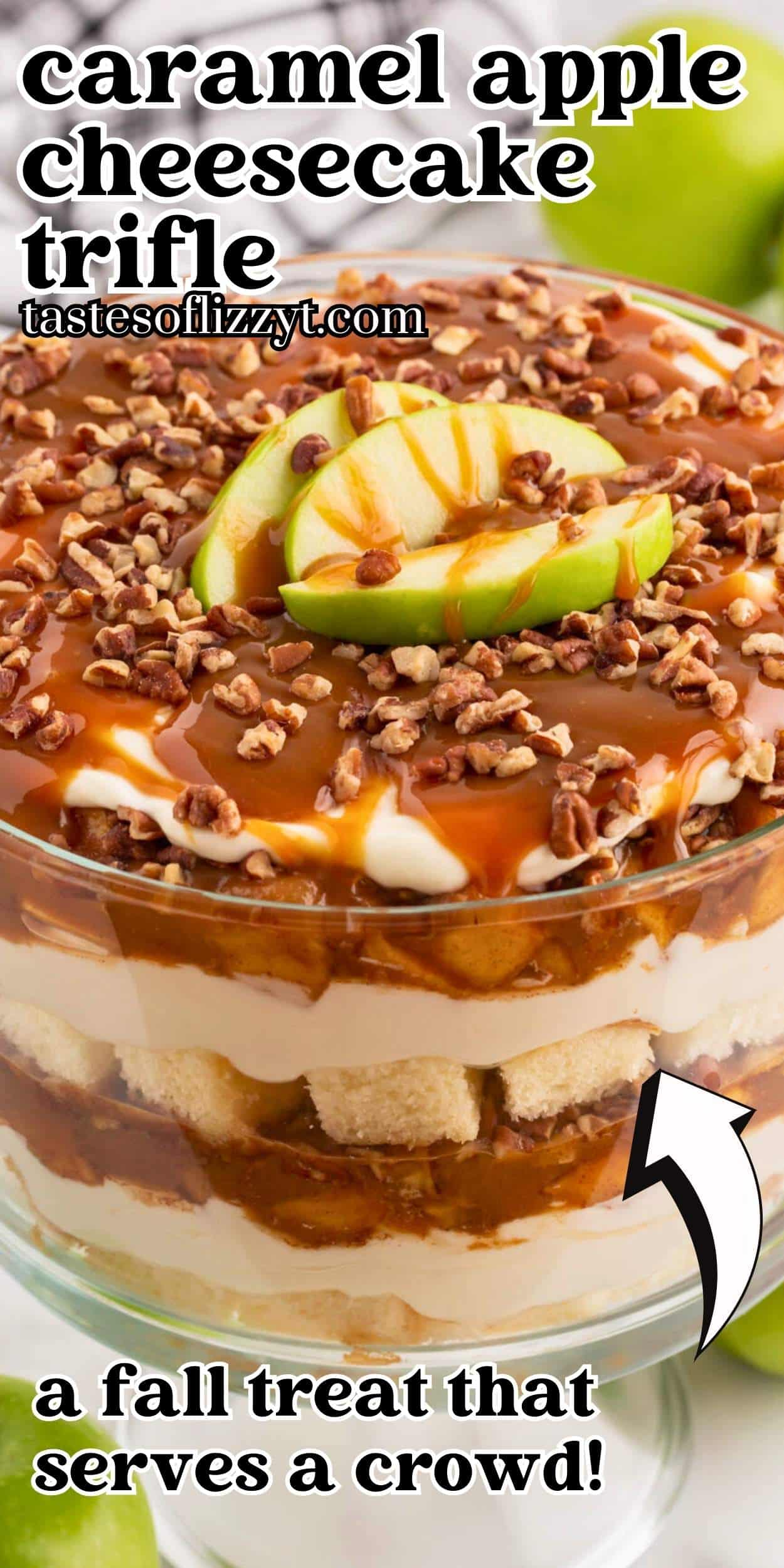 Layers of pound cake, fried cinnamon apples, creamy cheesecake, caramel & pecans make this trifle a stunning fall dessert perfect for parties.