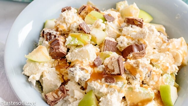 Crisp apples and Snickers meet to make this incredible Snickers Apple Salad! This recipe makes a great side dish for picnics. It's the easiest fall dessert you'll ever make!