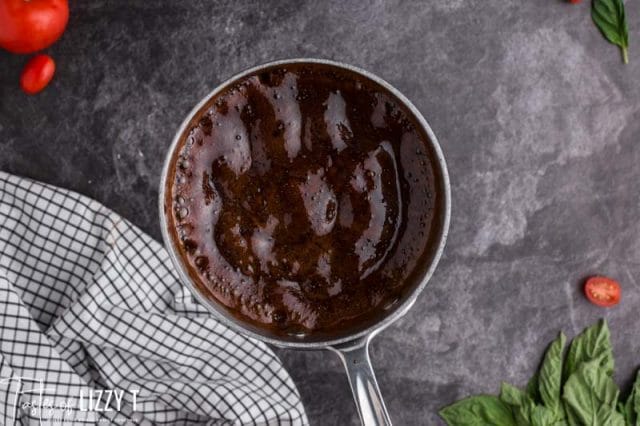 - As pizzas bake, prepare balsamic reduction. In a small saucepan, add the ½ c. of balsamic vinegar and brown sugar. Bring to a simmer for 6-8 minutes, stirring often. Liquid will reduce by half. Set aside. ½ cup balsamic vinegar, 2 tablespoons brown sugar