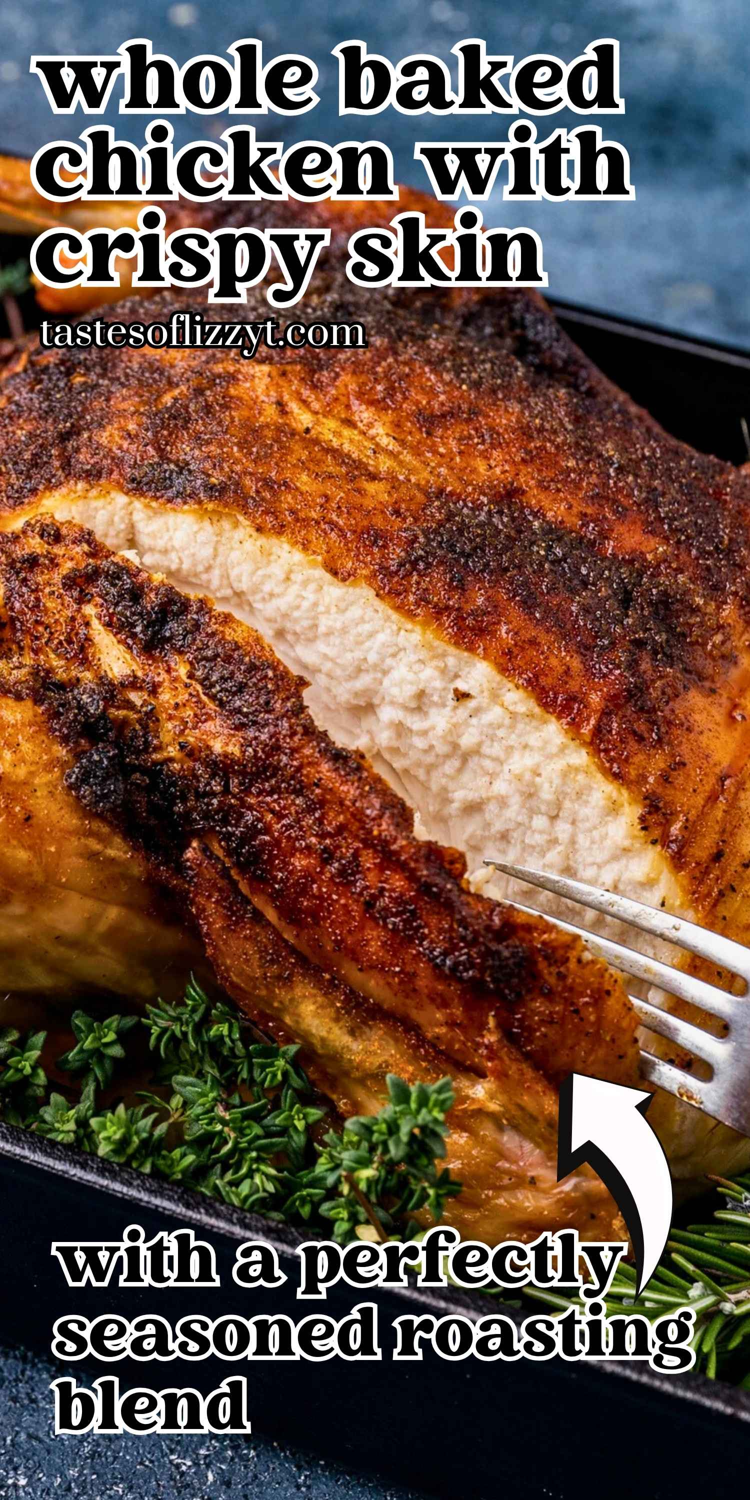 This oven roasted chicken takes less than 10 minutes to prep and bakes at a high temperature (400ºF rather than 350ºF) for extra crispy chicken skin. It’s simply seasoned with pantry staples, making it a no-fuss recipe that still looks and tastes impressive, like our baked bbq chicken and baked chicken legs. Serve baked whole chicken as a main dish and use leftover chicken meat in casseroles like our chicken and hash brown casserole, soups, or salads.