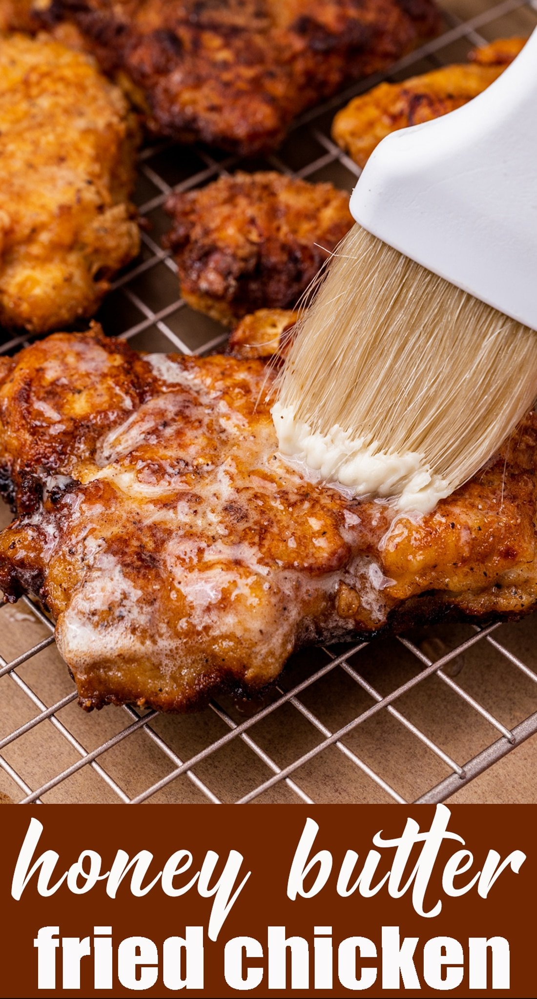 Once the chicken comes out of the frying pan, brush the honey butter over top the chicken for an unbeatable sweet & savory flavor.