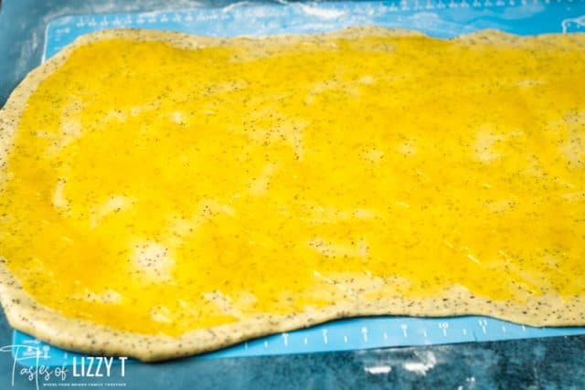 - Flour a rolling pin and roll the dough to about a 24×15" rectangle. Use a rubber spatula to smooth the lemon curd over the whole dough rectangle.