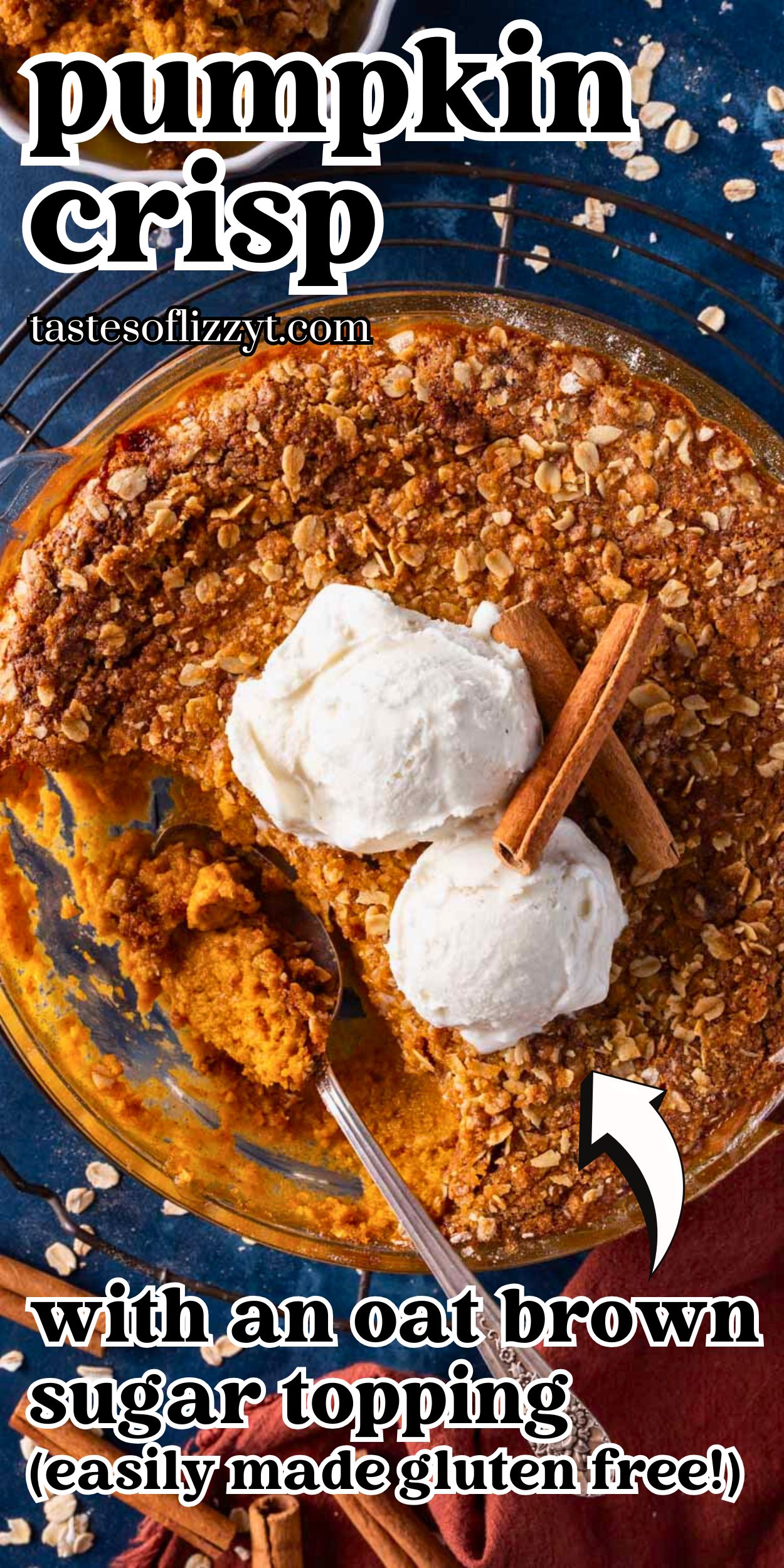 The oat crumble layers on top of the pumpkin pie filling in a pie dish. It bakes until golden brown and is irresistible with a scoop of ice cream and even a drizzle of caramel sauce.