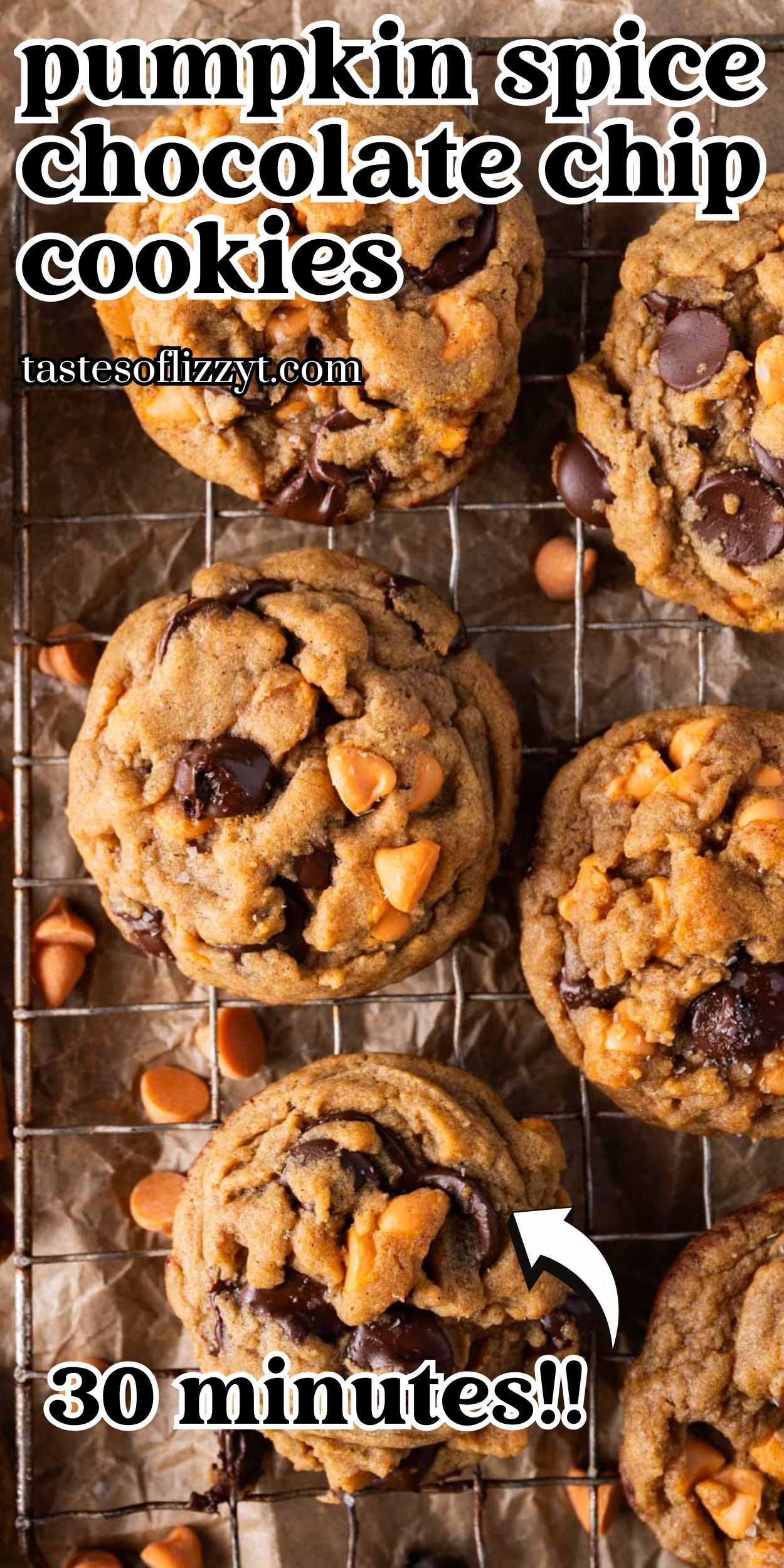 Chewy, soft, and easy pumpkin spice chocolate chip cookies are here! Made in 30 minutes with real pumpkin instead of an egg, molasses, and two kinds of chips.