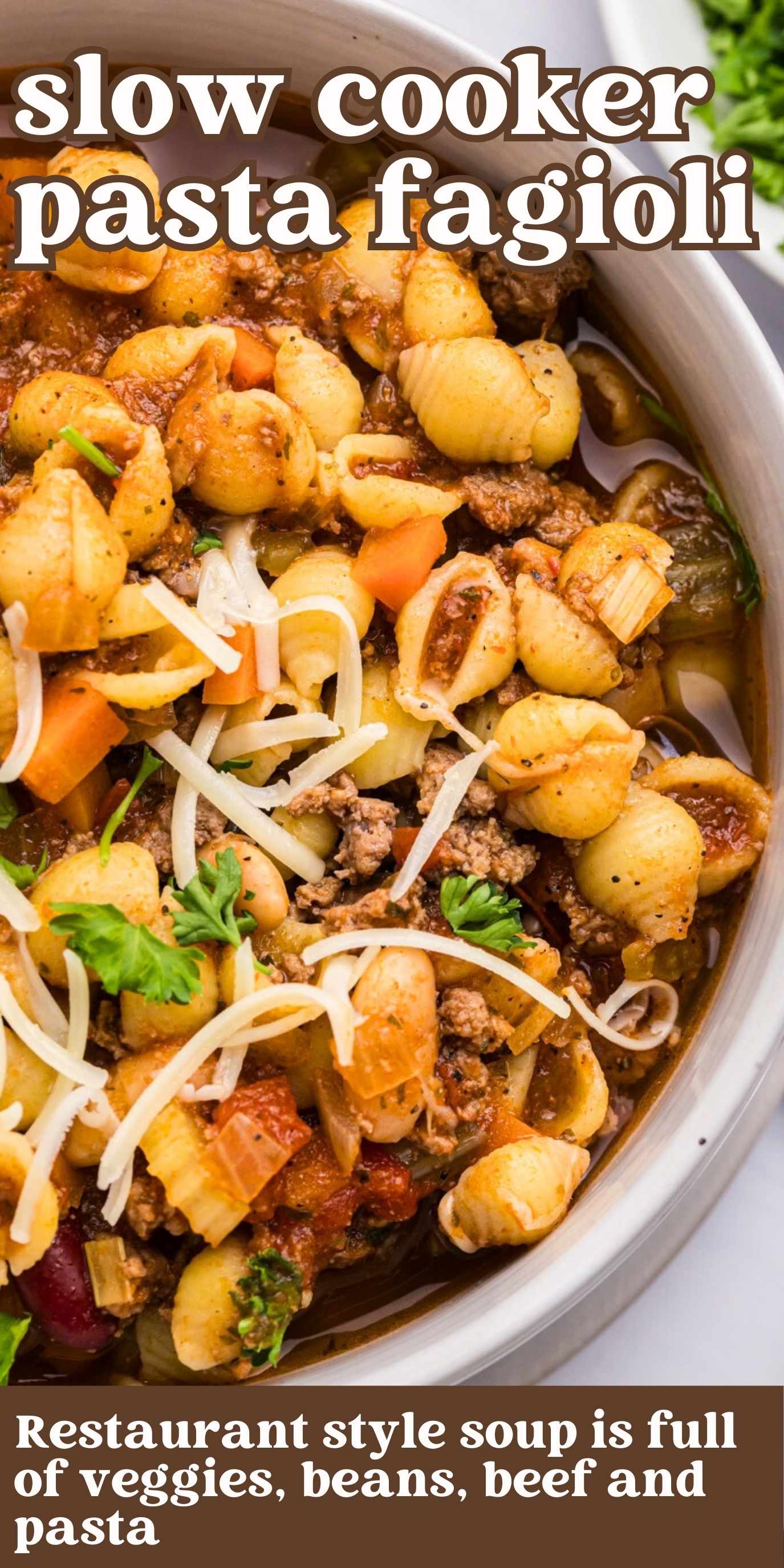 Slow Cooker Pasta Fagioli soup is full of veggies, beans, beef and pasta. A better-than-Olive Garden hearty Italian soup.