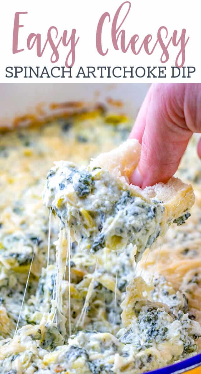 If you're looking for an easy appetizer, try this Spinach Artichoke Dip! This cheesy baked dip is packed with spinach and is perfect for parties and family gatherings.