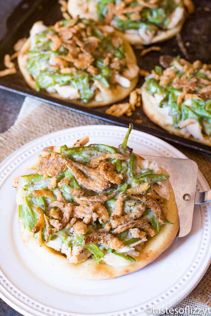 Thanksgiving Pizza? Yes! This turkey and green bean casserole pizza baked on naan bread has a savory butter drizzle. Ready in under 15 minutes!