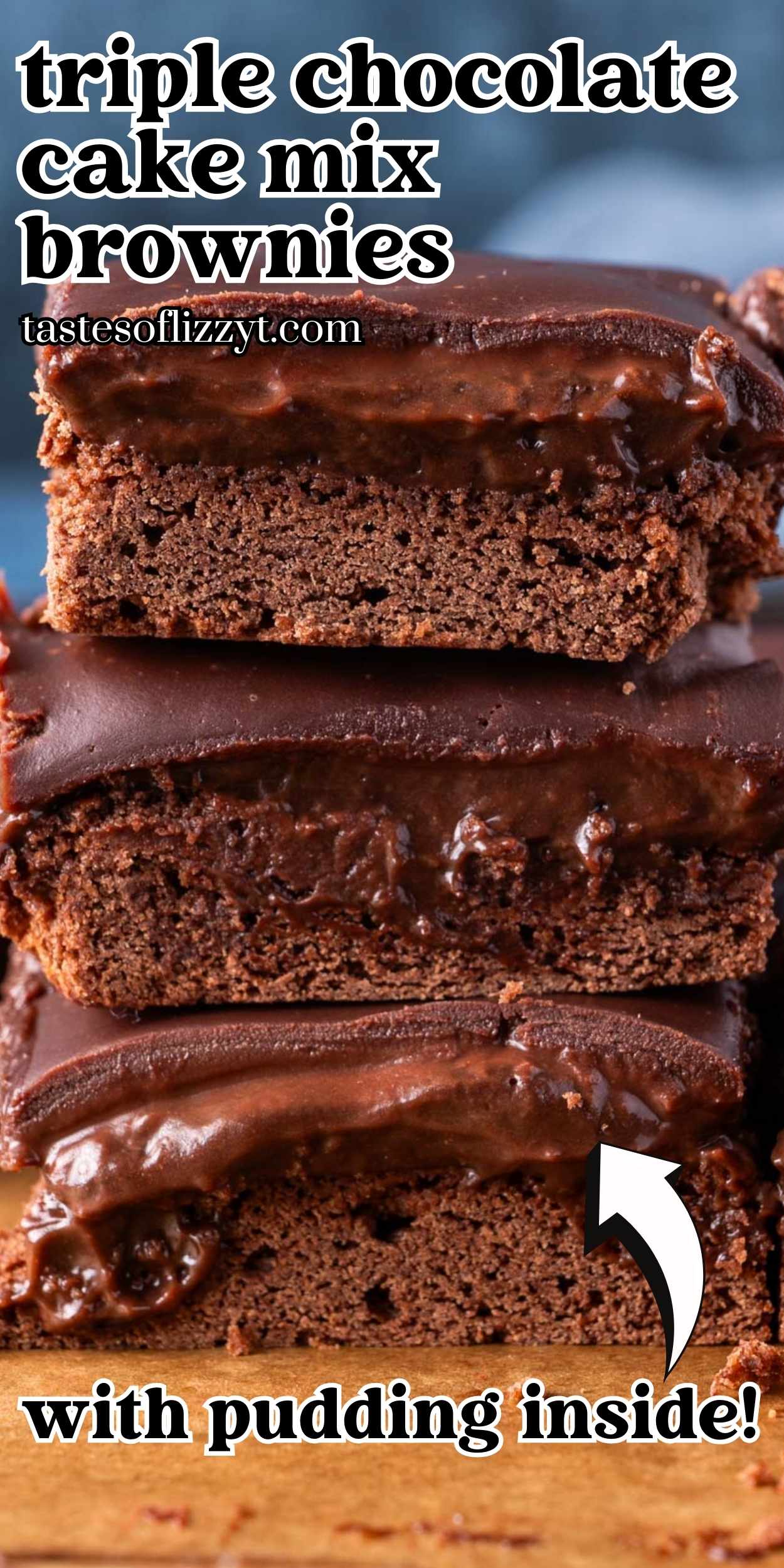 Indulge in these Triple Chocolate Cake Mix Brownies! A fudgy cake mix base topped with creamy chocolate pudding and rich ganache. The ultimate easy dessert to satisy your chocolate craving!
