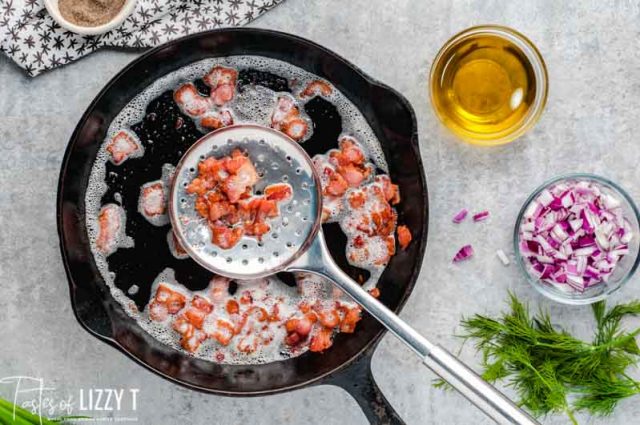 - While the potatoes are cooking, set a large skillet over medium heat and add the chopped bacon. When the bacon is crispy remove it to a plate with a slotted spoon. Save the grease to cook the onion!